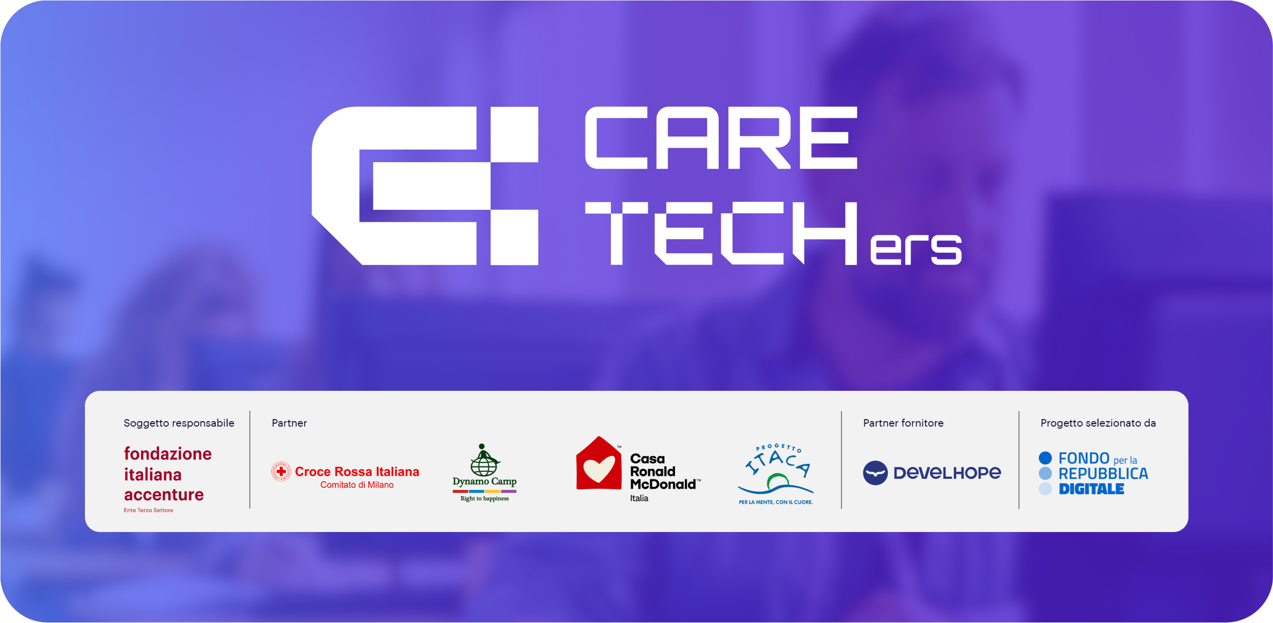 L’iniziativa è promossa da Fondazione Italiana Accenture ETS in qualità di soggetto responsabile, in collaborazione con Develhope, rivolta a 4 organizzazioni del Terzo Settore: Casa Ronald McDonald ETS, Fondazione Progetto Itaca ETS, Dynamo Camp ETS e Croce Rossa Italiana- Comitato di Milano. Il progetto è stato selezionato e sostenuto dal Fondo per la Repubblica Digitale – Impresa Sociale*, nell’ambito del bando Digitale Sociale.